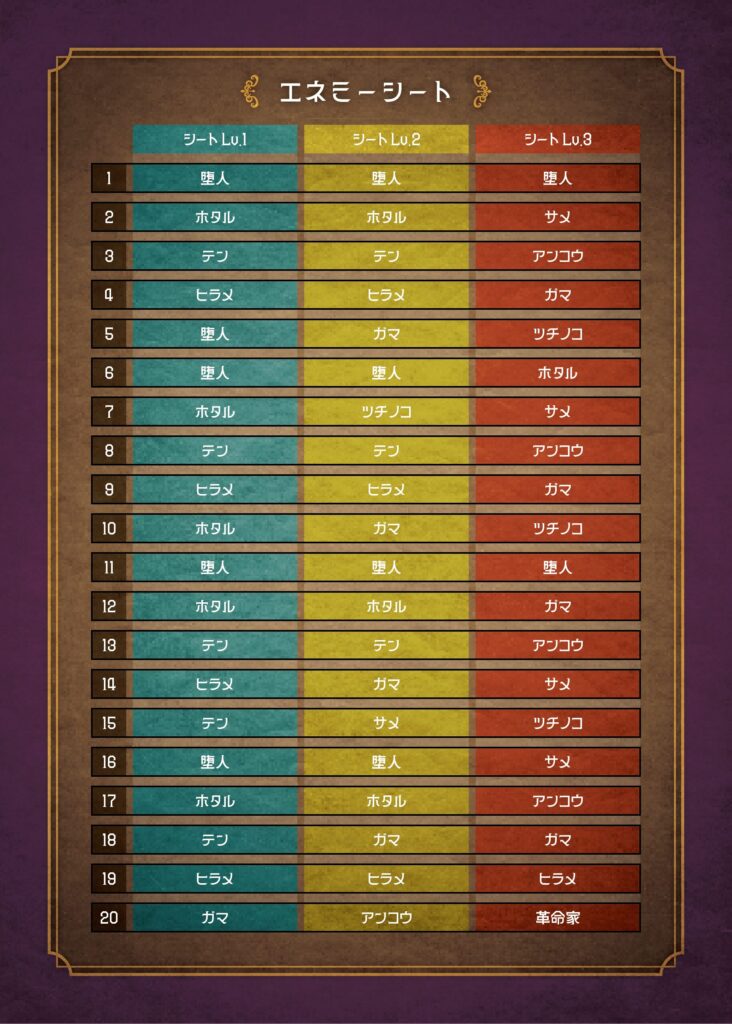 - エネミーシート・・・エネミー出現時にダイスを振って、該当の出目のエネミーを出現させる。