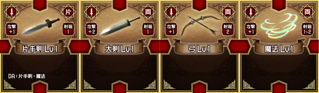 ・種類 両手剣、片手剣、弓、魔法があります。キャラクターごとに装備できる武器が異なります。